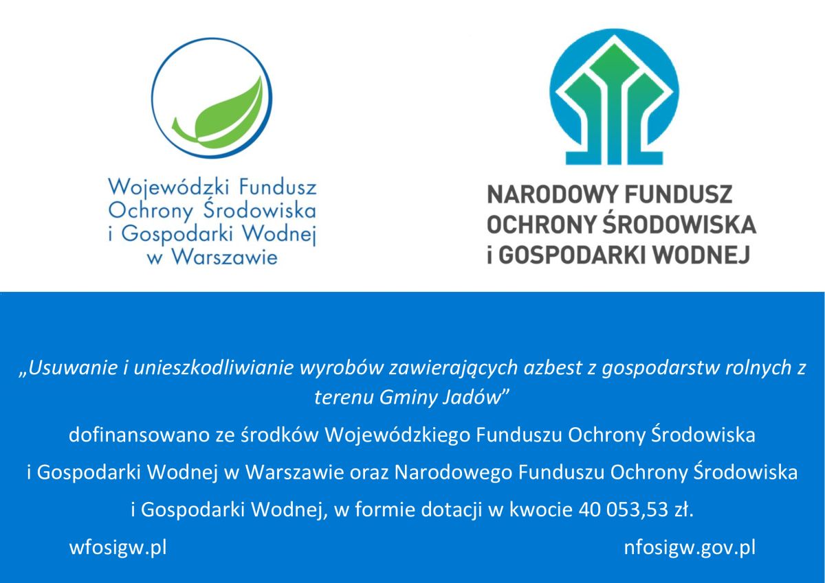 Burmistrz Miasta i Gminy Jadów informuję, że na mocy Umowy Dotacji Nr 0204/25/OZ/DA z dnia 19.08.2025r. otrzymaliśmy dofinansowanie z Wojewódzkiego Funduszu Ochrony Środowiska i Gospodarki Wodnej w Warszawie w kwocie 40 053,53 zł na realizację zadania pn. „Usuwanie i unieszkodliwianie materiałów zawierających azbest z gospodarstw rolnych z terenu Gminy Jadów”. Łącznie odebrano 67,8 Mg materiałów zawierających azbest.
