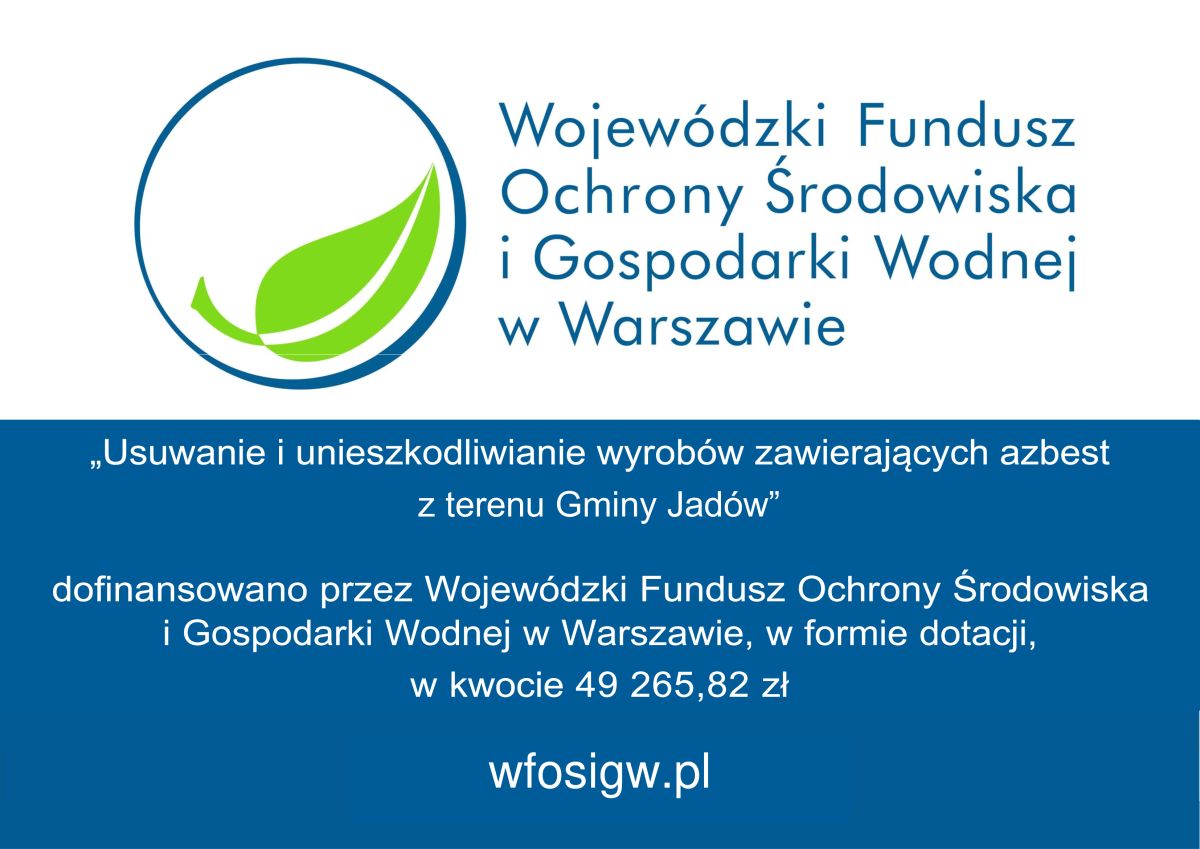 Burmistrz Miasta i Gminy Jadów informuję, że na mocy Umowy Dotacji Nr 0282/25/OZ/D z dnia 19.08.2025r. otrzymaliśmy dofinansowanie z Wojewódzkiego Funduszu Ochrony Środowiska i Gospodarki Wodnej w Warszawie w kwocie 49 265,82 zł na realizację zadania pn. „Usuwanie i unieszkodliwianie materiałów zawierających azbest z terenu Gminy Jadów”. Łącznie odebrano 81,75 Mg materiałów zawierających azbest.